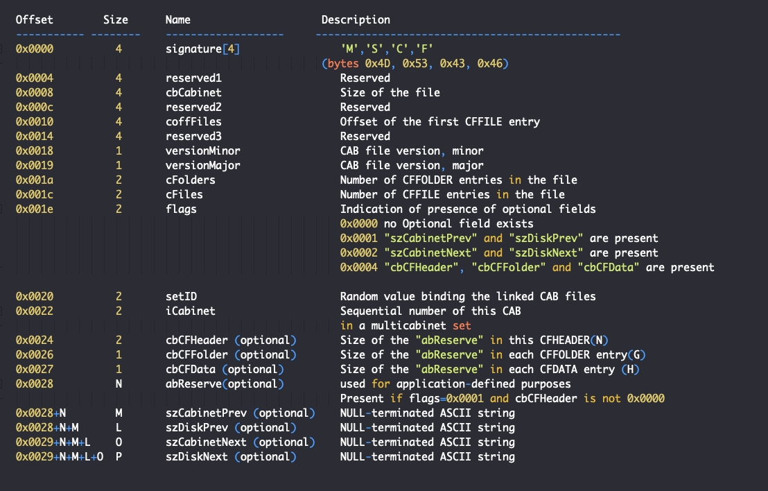 A cabinet file contains a cabinet header (CFHEADER), followed by one or more cabinet folder (CFFOLDER) entries, a series of one or more cabinet file (CFFILE) entries, and the actual compressed file data in CFDATA entries. The compressed file data in the CFDATA entry is stored in one of several compression formats, as indicated in the corresponding CFFOLDER structure [PDF]. The structure of the CFHEADER has the following format: