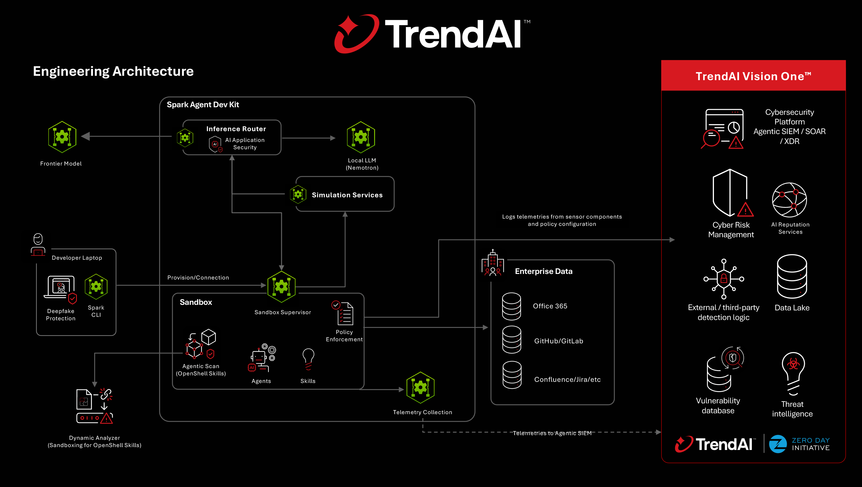 TrendAI brings decades of foundational knowledge in behavioral analysis, sandboxing, threat intelligence, and policy enforcement to agentic AI. For OpenShell, this expertise is applied through a layered architecture that secures agents before execution, during runtime, and after an action occurs.