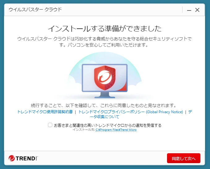 リンク先の内容確認および「トレンドマイクロからの通知」許諾を選択後、「同意して次へ」をクリックします。