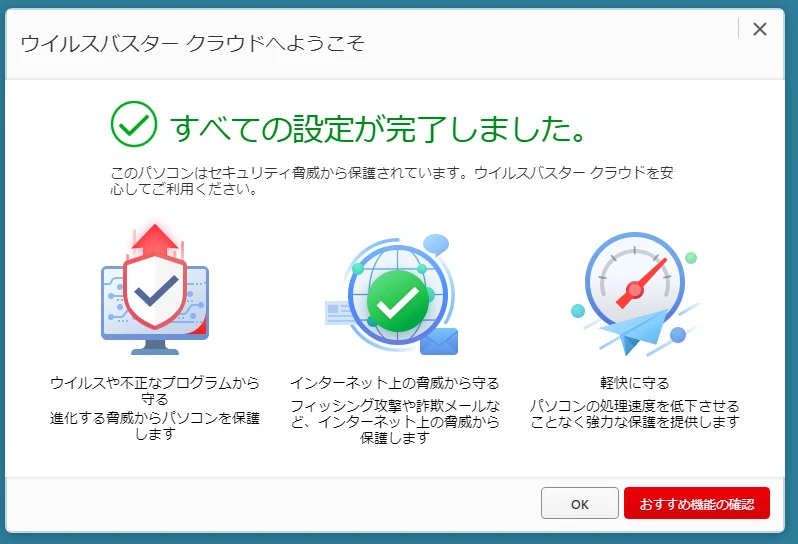 「OK」ボタンを押すと、ウイルスバスタークラウド30日無料体験版のセキュリティ機能が有効になります。