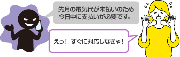 公共料金の未払いを理由に「1時間以内に電気が止まる」といって、プリペイドカードの購入を促す詐欺。「お金のことはちゃんとしなきゃ」と考える責任感の強い人ほど注意が必要です。