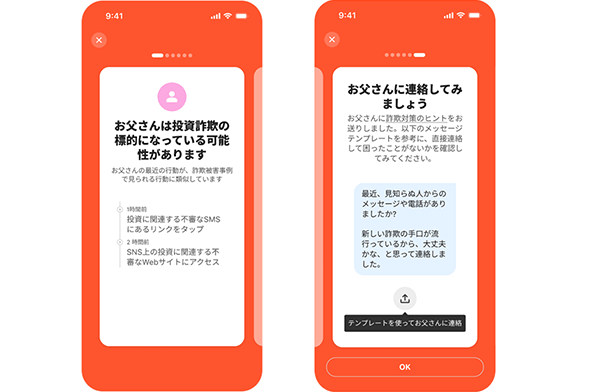 万が一、ご家族の端末で詐欺のリスクが検知された場合は、ご家族の管理者に通知が届くため、迅速に必要なコミュニケーションをとることができます。