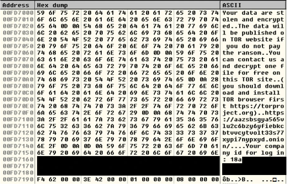 ランサムノートには、攻撃者が匿名ネットワーク「The Onion Router(Tor)」上に設置した不正サイトのURLや企業ID(攻撃者が特別に割り当てた識別番号)が記されています。同じハッシュを持つ検体を異なる仮想マシン上で実行した場合、ランサムノート上に提示される企業IDはすべて同じでした(図7)。