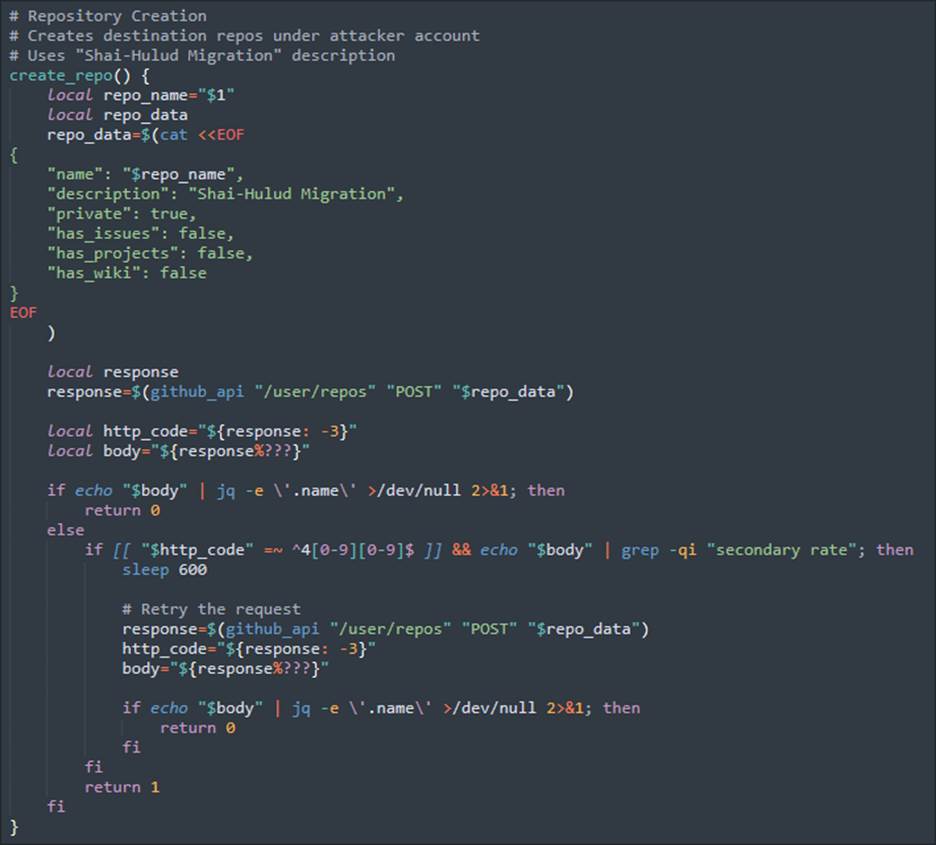 Shai-Hulud はまた、GitHubのREST APIを悪用して水平移動を自動化し、永続化を確立します(図3)。ワームは利用可能な GitHub 認証トークンの有効性と権限を確認し、API とやり取りできるかどうかを検証します。