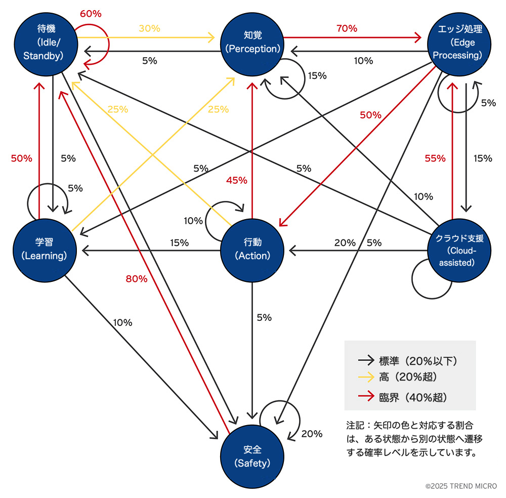 この図は二つの観点から読むことができます。第一に、支配的な経路(dominant path) は高確率で繰り返されるローカルループ(知覚 → エッジ処理 → 行動 → 知覚/待機)であり、エッジ優先・クラウド補助型の設計方針に対応します。第二に、頻度は低いが重要な分岐(rare but important branches) として、エッジ処理 → クラウド支援 の呼び出し、定期的な「学習」、そしてシステムを停止させずにリスクを低減する「安全」経路があります。