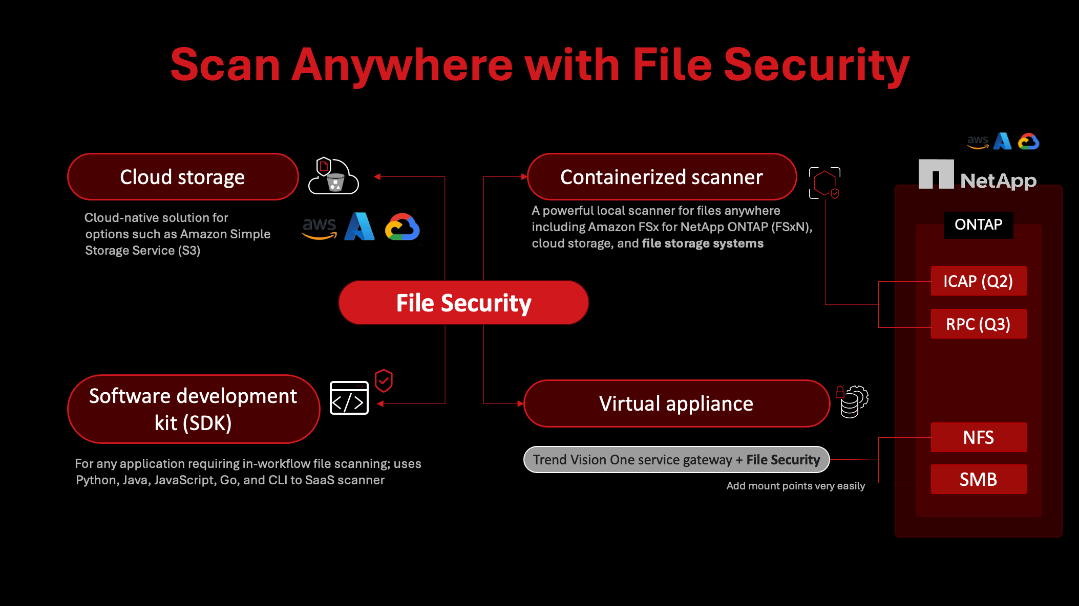 重要ポイントである理由: ワークロードの枠を超え、ファイル層にまでCNAPPの保護範囲を拡張しています。クラウドストレージ内のマルウェア検出からワークフロー保護まで、すべての資産を見逃さないセキュリティを実現します。Gartner® は「コンテナ、仮想マシン、サーバーレス関数、データストレージを含むすべてのアーティファクトの検査」を推奨しています。Trend Vision One はその包括的な保護を実現しています。