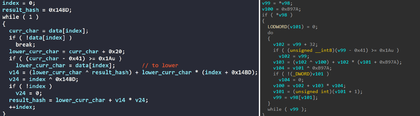 また、本分析調査により、これらの新亜種に共通する主要な不正活動が判明しました。具体的には、ランダムな16文字のファイル拡張子の付与、ロシア語設定が検出されたシステムへの攻撃回避、暗号化後のイベントログ消去などが挙げられます。さらにLockBit 5.0とLockBit 4.0のソースコードにて共通する特徴が明らかとなりました(図20、21)。LockBit 4.0とLockBit 5.0には、APIに対する動的名前解決や暗号化活動を妨害する可能性のあるサービスを識別する際に重要な要素となる文字列を変換するために類似したハッシュアルゴリズムが採用されていることから、LockBit 5.0は、名前だけを当てがった偽物ではなくLockBit 4.0のコードベースを高度化させたものであることが裏付けられました。