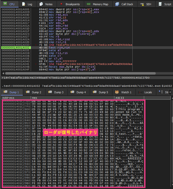 トレンドマイクロが分析した検体には、パッキングによる高度な難読化が施されていました。さらに同検体がメモリ内でPEバイナリを復号した後、反射型DLLインジェクションの手法で読み込むバイナリローダとして機能することがデバッグ中に判明しました。LockBitグループは、ディスクへの書き込みを回避する手法(ファイルレス活動)を採用することで、静的解析を著しく困難にしています。