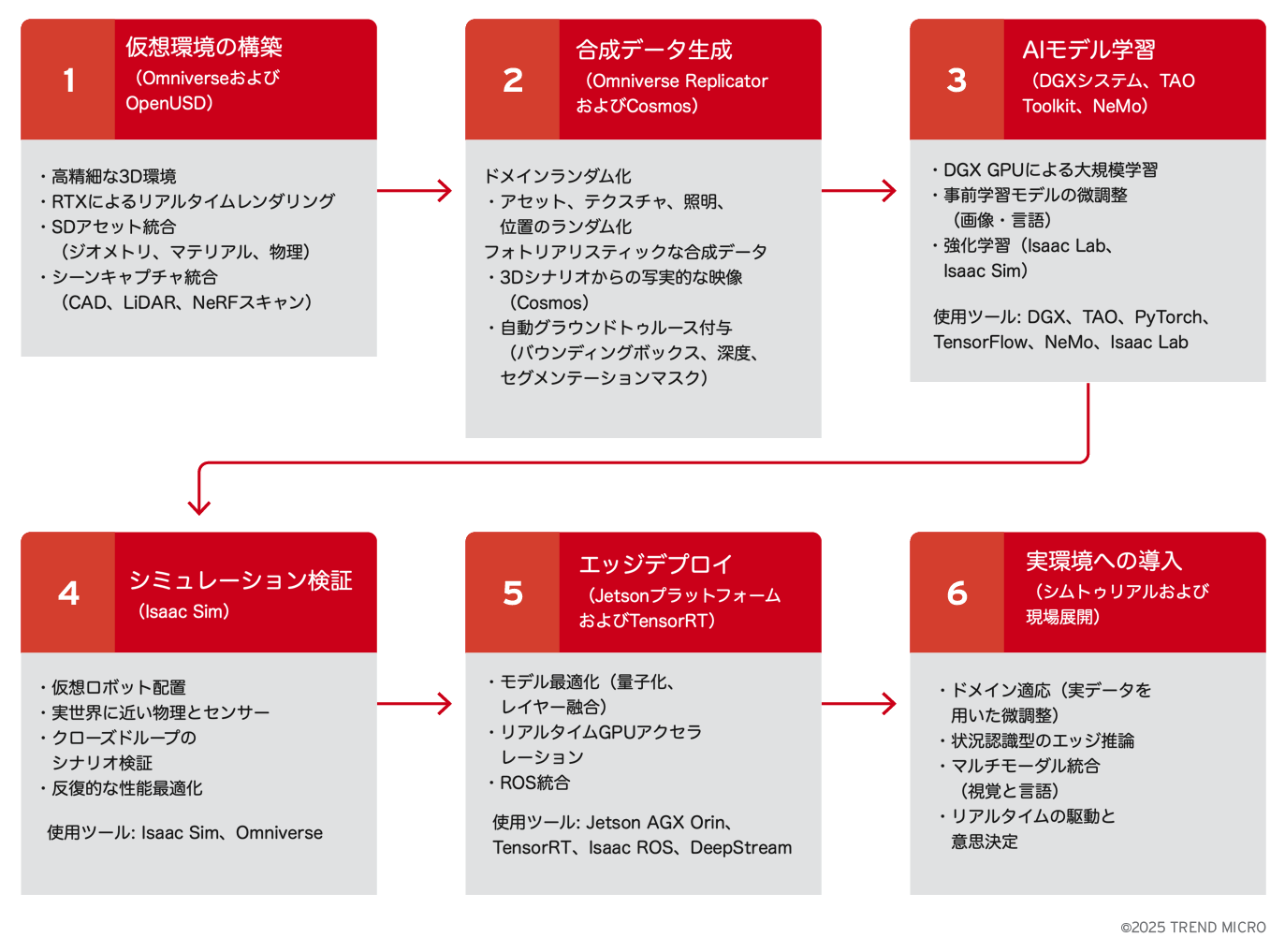 エージェンティック・エッジAIの開発パイプラインにおける各工程(NVIDIA OmniverseとIsaacによる構築、またはROS 2、Gazebo、PyTorch、ONNXなどによる構築を含む)は、それぞれが固有の攻撃面を持っています。脅威はデジタルツインの生成段階から始まり、学習、デプロイメント、現場での運用に至るまで継続します。リスクがライフサイクルのどの段階で発生するかを把握することが、多層的な防御を行う第一歩となります。