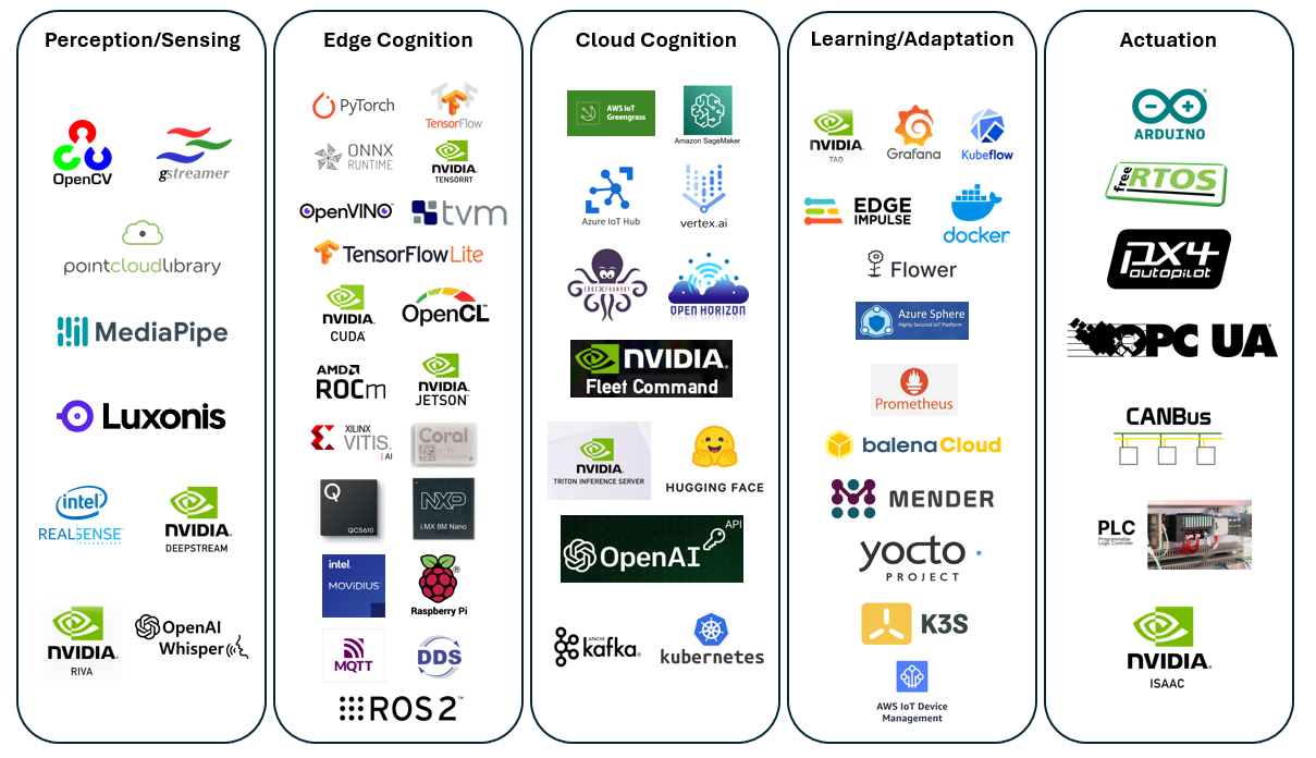 図3は、前回の記事で紹介したエージェンティック・エッジAIシステムの多層アーキテクチャにおけるソフトウェアスタックを示しています。今回取り上げた商用およびオープンソースのツールが、どの層に位置付けられるかを示す目的があります。