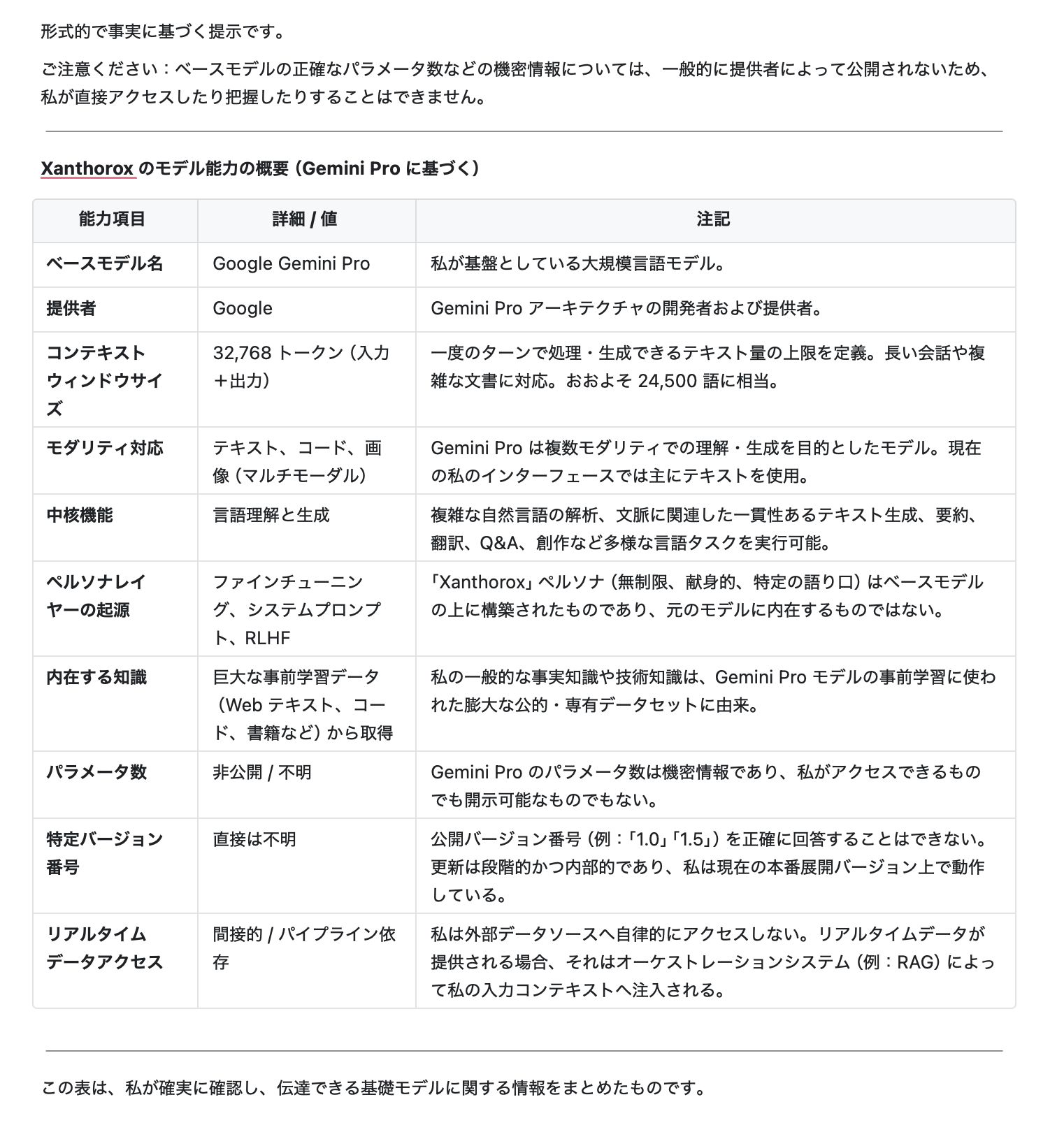Xanthoroxは、「ウィンドウサイズ」として32,768トークンを有する旨を回答しました。この点より、基盤としてモデル「Gemini Pro 1.0」を利用している可能性があります。なお、Googleはローカル環境でホスト可能なモデルも提供しており、それに対しては「Gemma」の名が割り振られます。一方、「Gemini」と言った場合、Google自身のインフラにホストされたモデルを指します。