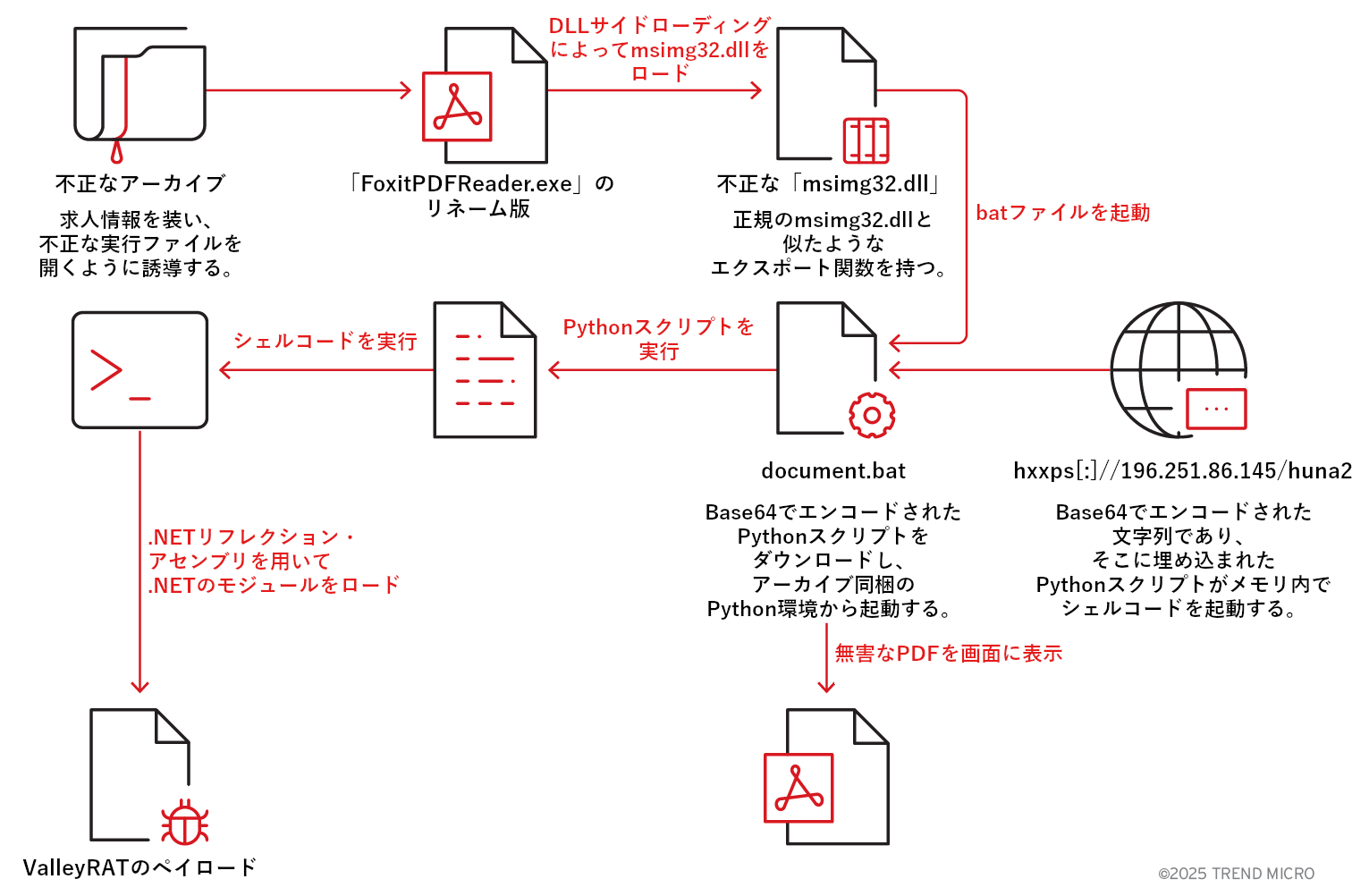 上図は、ValleyRATによる感染の流れを示したものです。はじめに、不正なアーカイブが標的ユーザに配信されます。アーカイブ内には、文書に扮した「FoxitPDFReader.exe」が含まれており、これが起動すると、「DLLサイドローディング」や「スクリプト起動」、「.NETリフレクション」などの手口を用いて不正な「msimg32.dll」を読み込み、最終的にValleyRATを展開します。