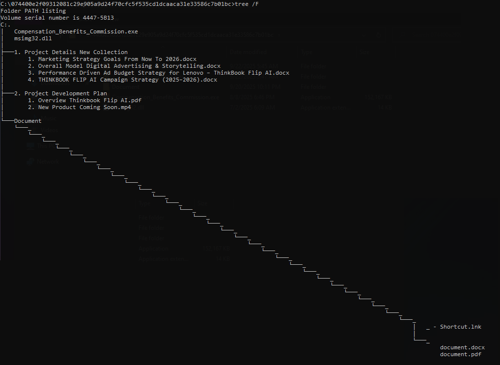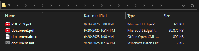 アーカイブ内のフォルダ階層をたどると、文書に扮した実行ファイルやDLLファイルの他にも、複数のファイルが隠しこまれています。隠し属性フォルダ「Document」の配下には、アンダースコア文字の名前を持つサブフォルダが幾層にもネスト化されており、その最深部に「Shortcut.lnk」や「document.pdf」などのファイルが配備されています。この構造は、隠蔽や難読化を意図したものと考えられます。