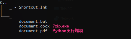 バッチファイル「document.bat」は、「document.docx」を利用して「document.pdf」の内容を抽出します。「document.docx」は文書のような拡張子を持ちますが、その実体は7zipの実行ファイルであり、「document.pdf」からPython環境のアーカイブを取り出します。