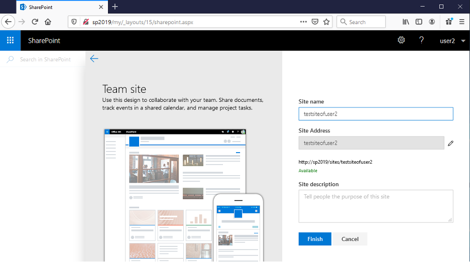 Pick a name for the new site. Here we use testsiteofuser2.