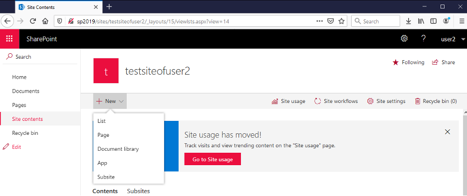 Now we need to create a new list. Click on the “Site contents” link:
