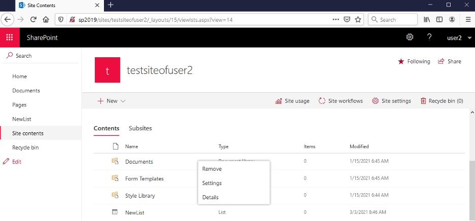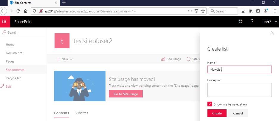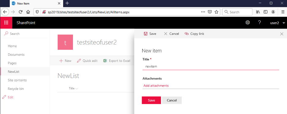 - BaseUrl of the target SharePoint Site (in this case http://sp2019/sites/testsiteofuser2/)