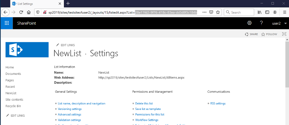 We will need the ListID of this new list. Let’s go back to the “Site contents” page and click on “Settings” in the dropdown menu for our new list: