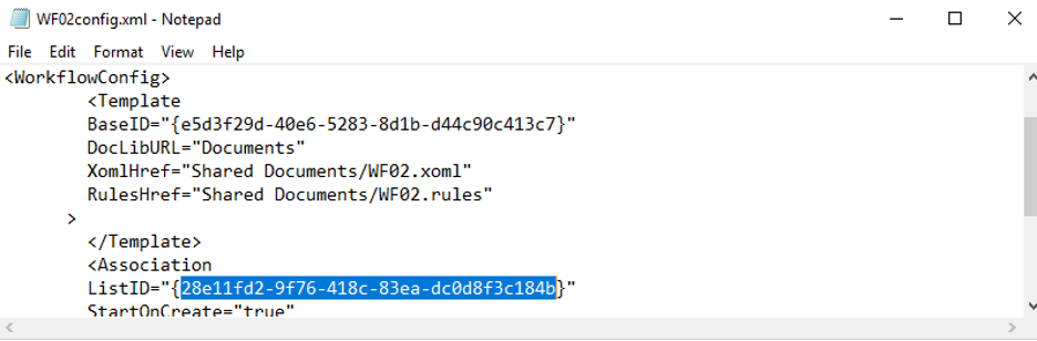 We need to place this value into the ListId attribute in the workflow config file, WF02config.txt: