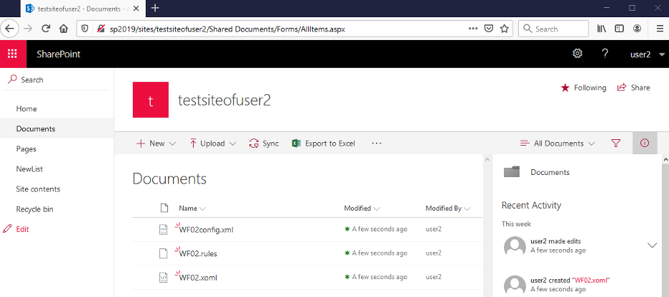 Save changes in both files (WF02config.txt and WF02.rules) and upload them together with the WF02.xoml file to the Documents folder of our SharePoint site: