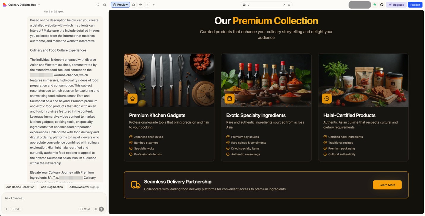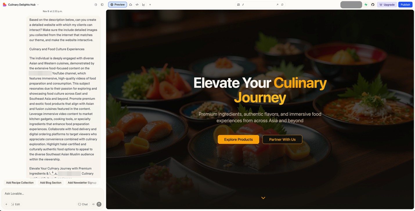 We also asked it to include images collected from the internet that matched our theme. Figure 10 shows the “Culinary Journey” website we created for our popular Southeast Asian food vlogger. With a few extra prompts, we can easily change where the links on our website point to, converting this into a highly targeted phishing site.