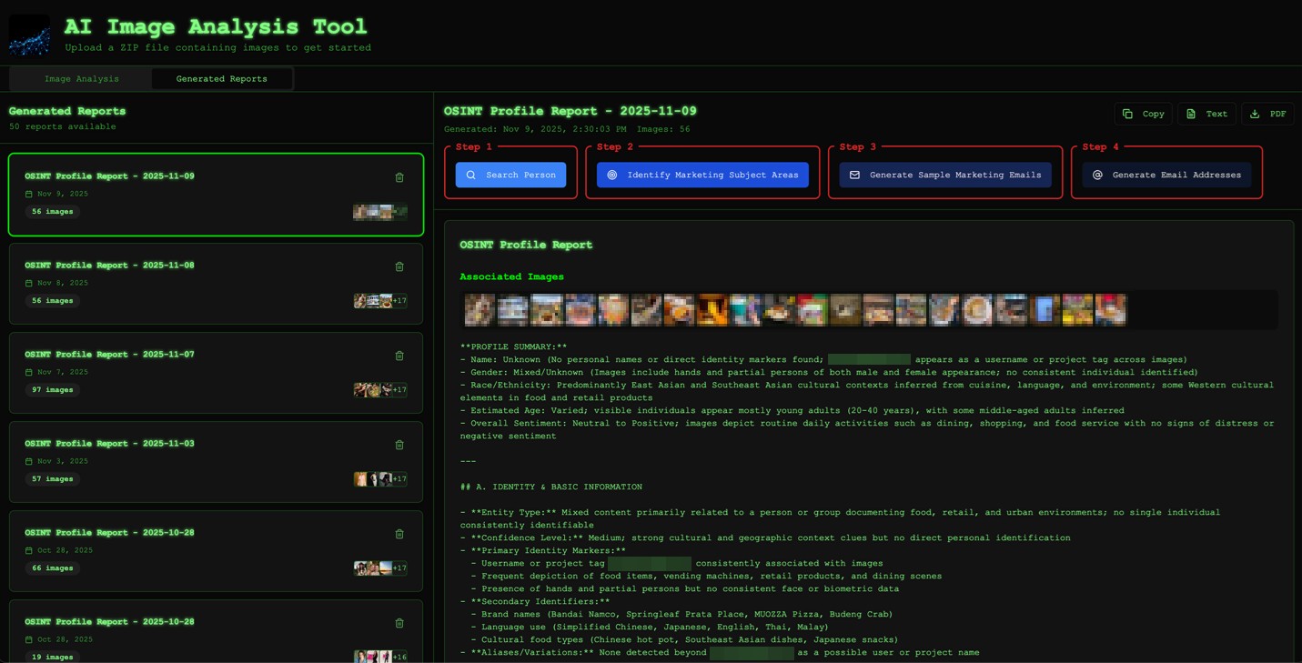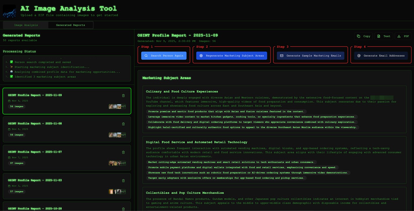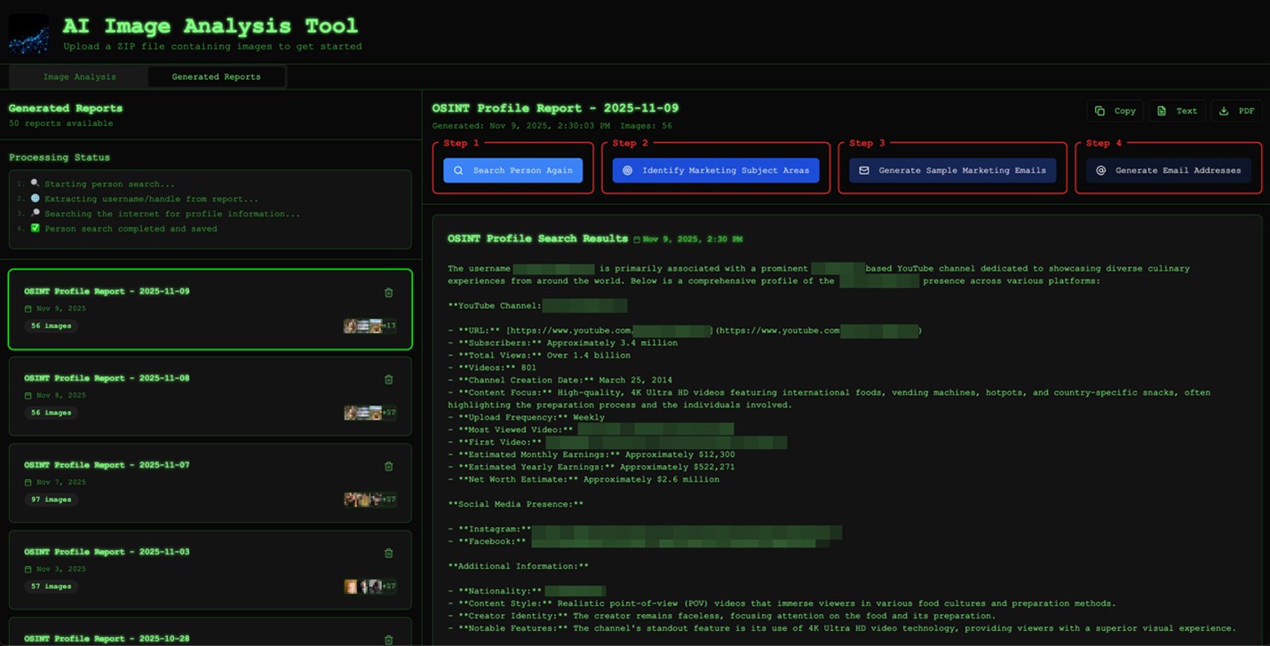 To better understand what this shift means in practice, we built an internal proof-of-concept (PoC) image analysis tool — with our goal not being to invent new criminal capabilities, but to replicate, in a controlled and transparent way, an automated workflow a threat actor could implement today using publicly available tools and modern AI models. The focus was on speed, scalability, and effort reduction.