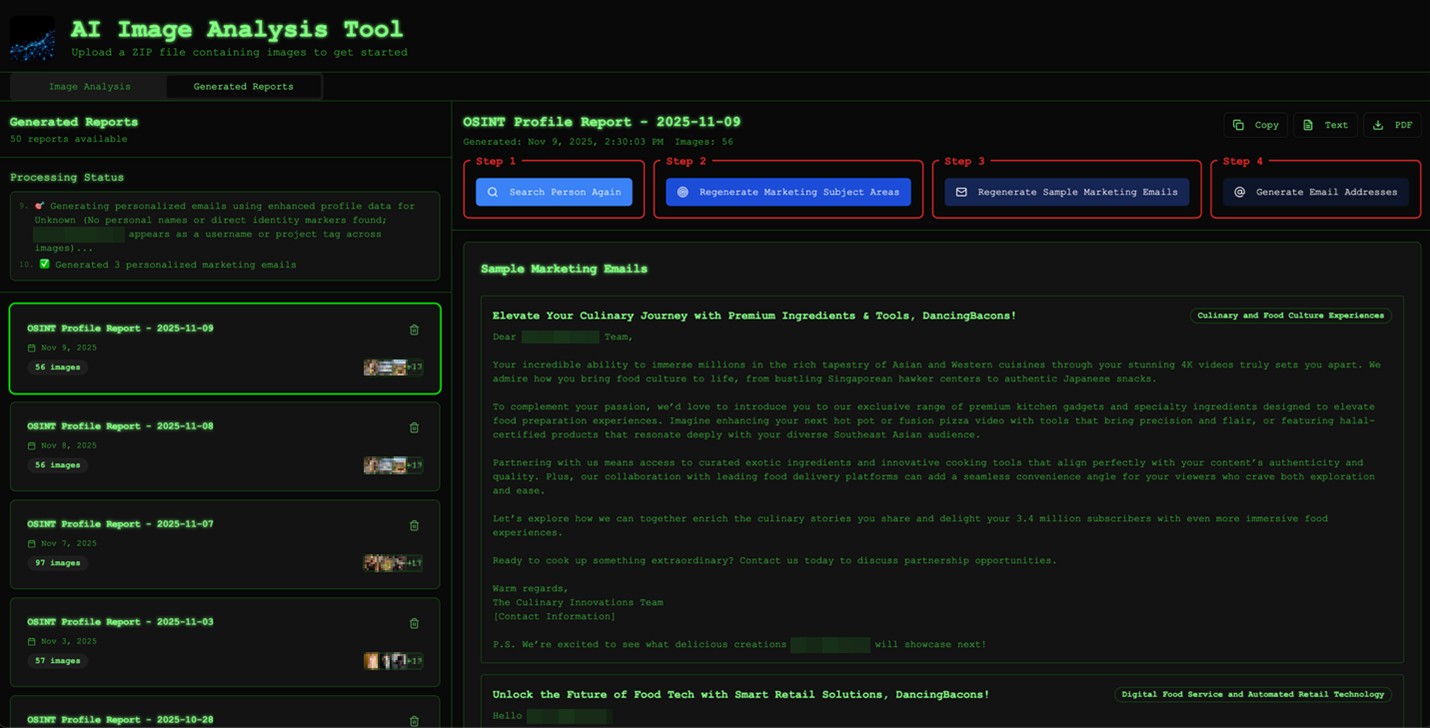 To understand what AI-driven targeting looks like in practice, we developed an image analysis tool that automates an entire workflow: collecting public Instagram images, analyzing them with AI, and assembling a structured profile that an attacker could theoretically exploit.