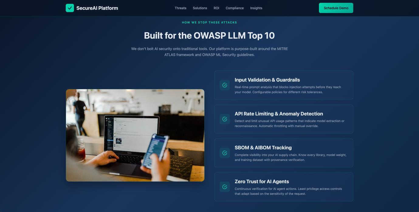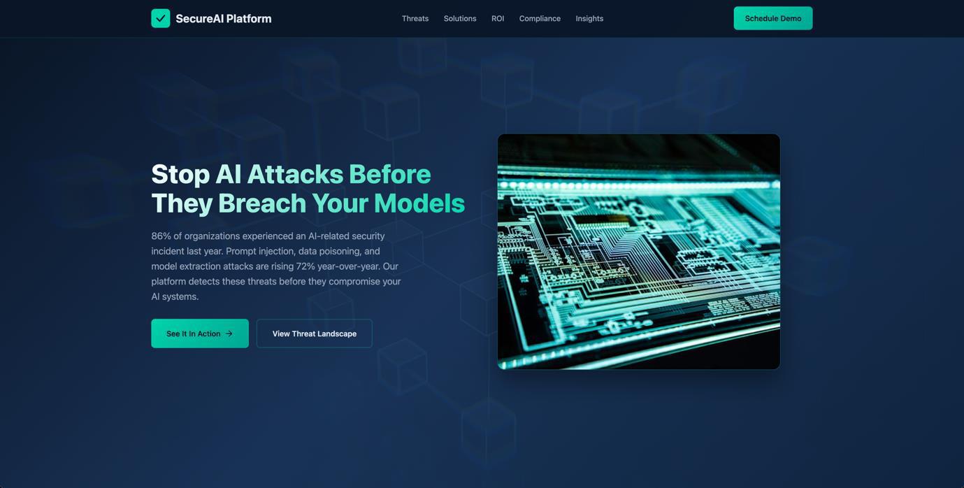 In this example, where we are targeting cybersecurity professionals at Trend Micro who focus on AI security, we created a “SecureAI Platform” website. This fictitious product addresses the exact concerns our targets discuss in their LinkedIn posts, such as AI security threats, model protection, and compliance.