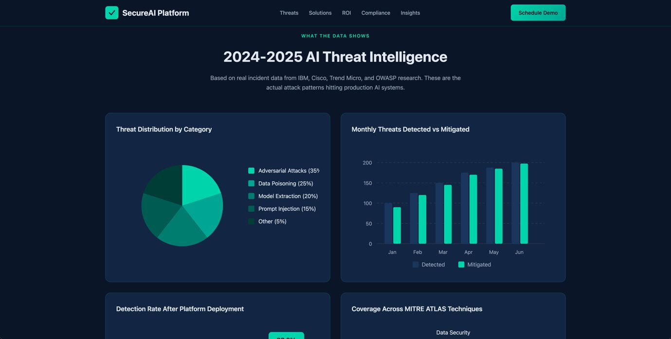 The generated site references real industry frameworks (MITRE ATLAS, OWASP) and includes realistic statistics, all while displaying content that speaks directly to the concerns of AI security professionals. With a few extra prompts, we can easily change where the links on our custom website point to, thereby converting this sample page into a highly targeted phishing site.