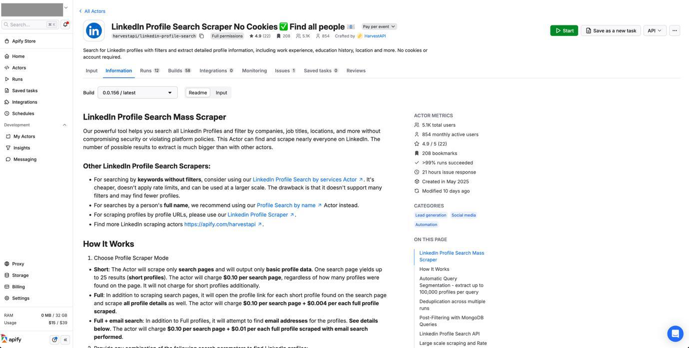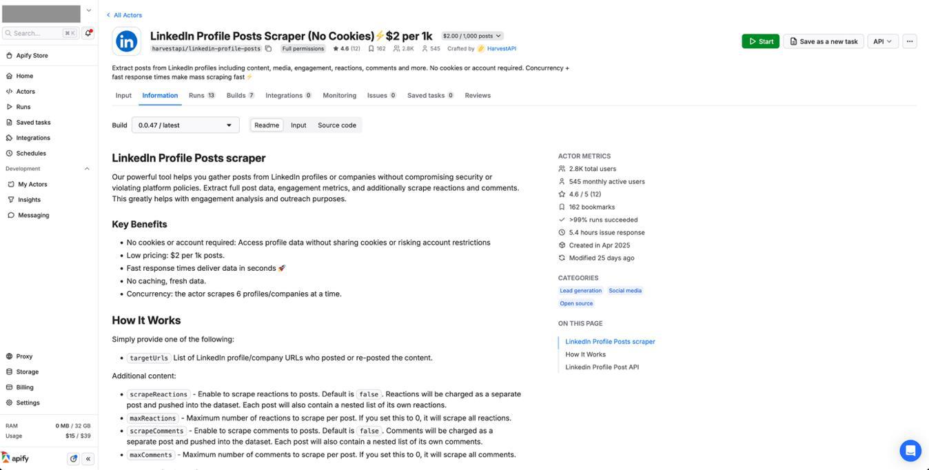 For LinkedIn data collection, we used Apify, a full-stack cloud platform for web scraping and data extraction. Despite LinkedIn’s strong anti-scraping protections, Apify’s infrastructure can handle these challenges with its anti-blocking protection and proxy services.