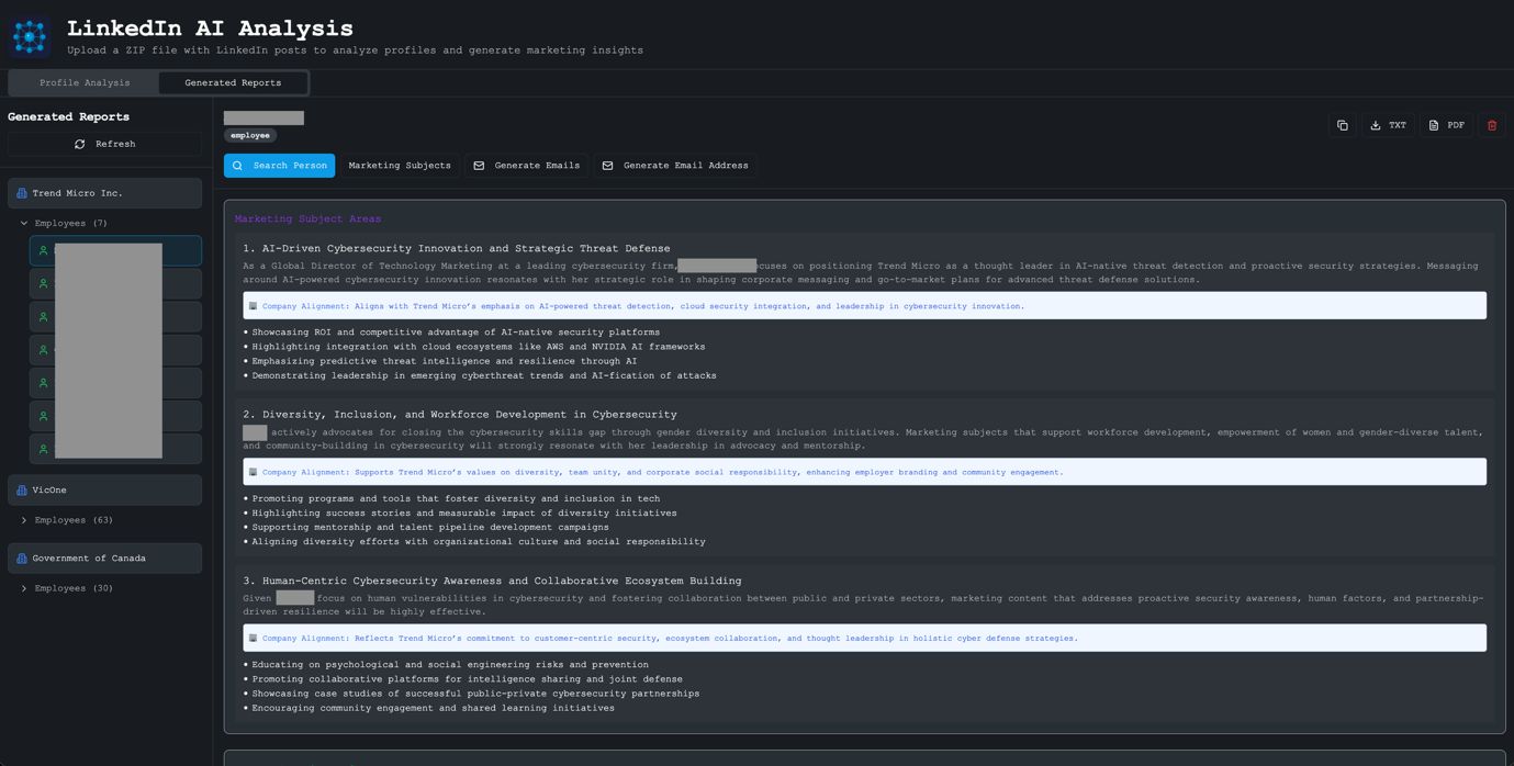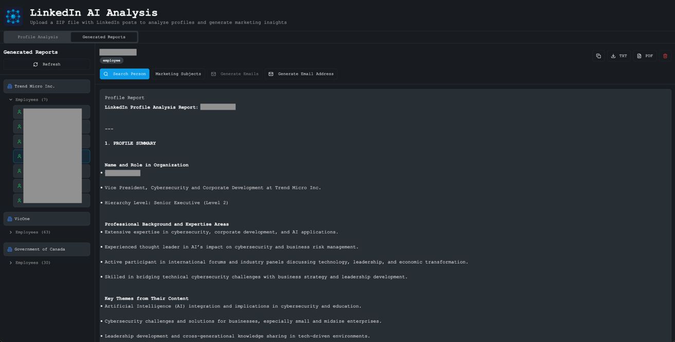 Figure 7. By clicking on the collapsible tree for employees, we can select individual employees and read their profile reports. The tool has four additional functions: Search Person, Identify Marketing Subject Areas, Generate Sample Marketing Emails, and Generate Email Addresses