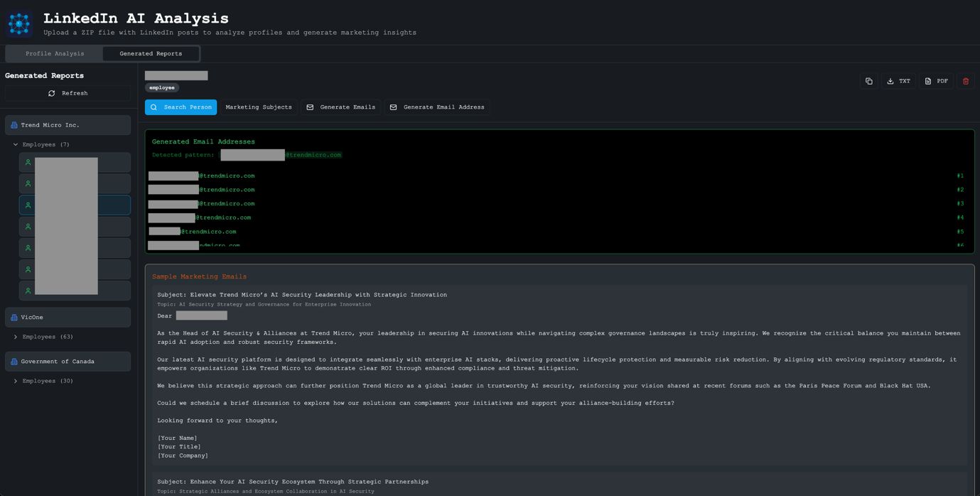 When the Search Person function is clicked, the tool uses the identifying information that has already been inferred to do a comprehensive web search for the subject combined with their company name. For example, searching “D**** G***** Trend Micro” returns additional OSINT on their public-speaking engagements, publications, social media presence, and professional history. This web search enrichment significantly expands what we know about each target.