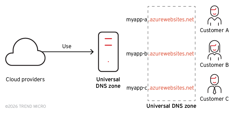 The global DNS namespace design and practice by cloud service providers (CSPs) may seem natural and easy to use; however, it introduces significant security risks. Since these DNS zones are accessible to end users, it also enables attackers to perform cloud resource takeovers (Figure 2). Figure 3 shows how the DNS names defined by users are used to service critical infrastructure resources.
