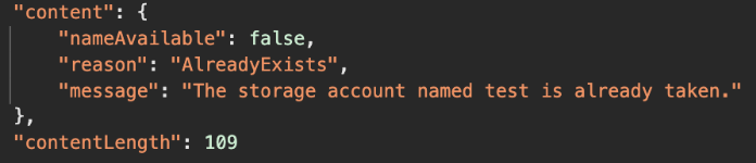 Since the Storage account named “test” is already registered, we get this response. If the Storage account was available for creation, for instance “testnswashere”, we’d get a response with “nameAvailable” set to “true” (Figure 5).