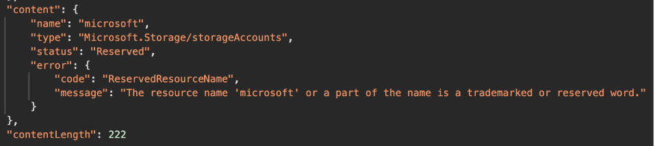 Some edge cases that we came across were when the name of the Storage account contains a trademarked or a reserved word, like “Microsoft”. In that case, we’d get the following response (Figure 6):