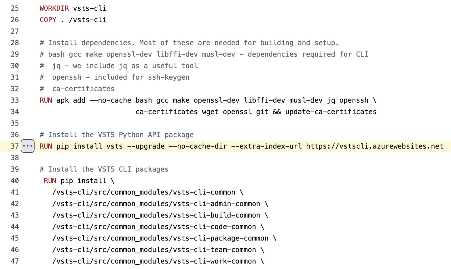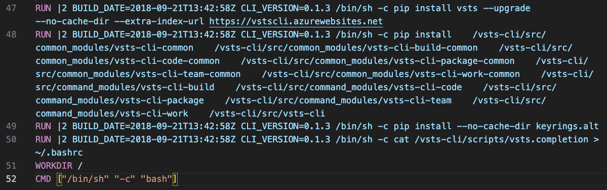 When this tag of the container image was built or will be built from the source Dockerfile, it would execute the RUN directive. It contains a “pip” command to install a Python package named “vsts“. Visual Studio Team Services (VSTS) is now known as Azure DevOps; the “vsts“ package is the VSTS CLI that one can use to work with Azure DevOps service.