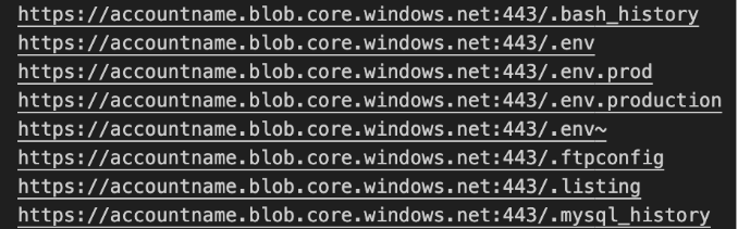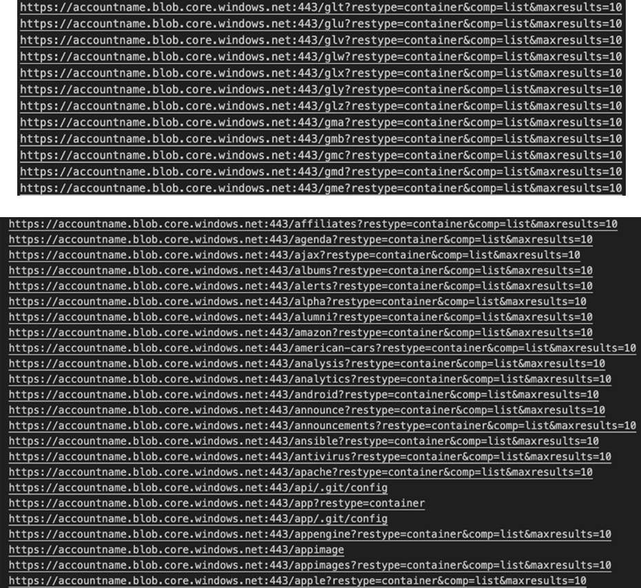 We saw scanning for well-known configuration files that generally contain credentials or sensitive information. Most of the attempts were brute forcing container names in the pattern [a-z]{3}, and wordlists guessing WordPress, Firebase, Git config paths trying to the list contents of blob containers by leveraging the REST API (inferred from the URL parameters), shown below in Figure 15.