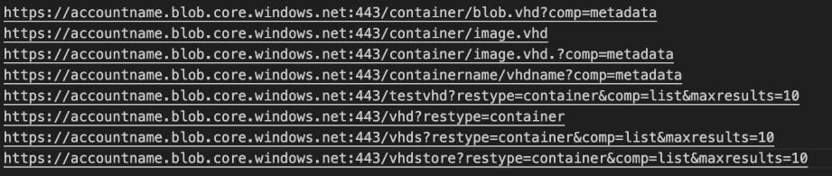 Figure 16. Attempts to fetch VHD blobs and containers from Storage account “accountname”