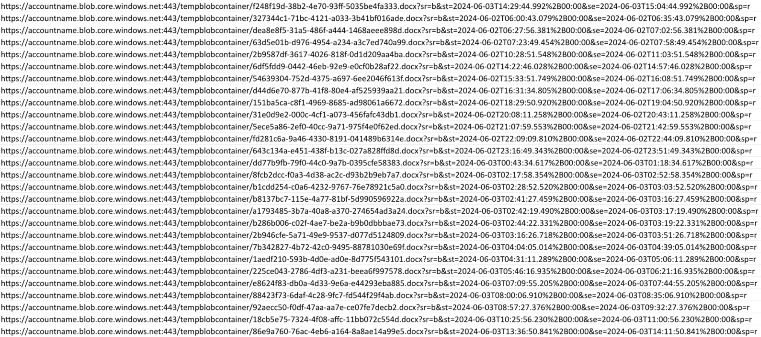 For a particular user-agent, “OfficeWordCA”, we saw over 1,000 anonymous requests attempting to fetch Word documents with UUIDv4 names from the blob storage endpoint using a read-only service SAS token, as shown in Figure 18: