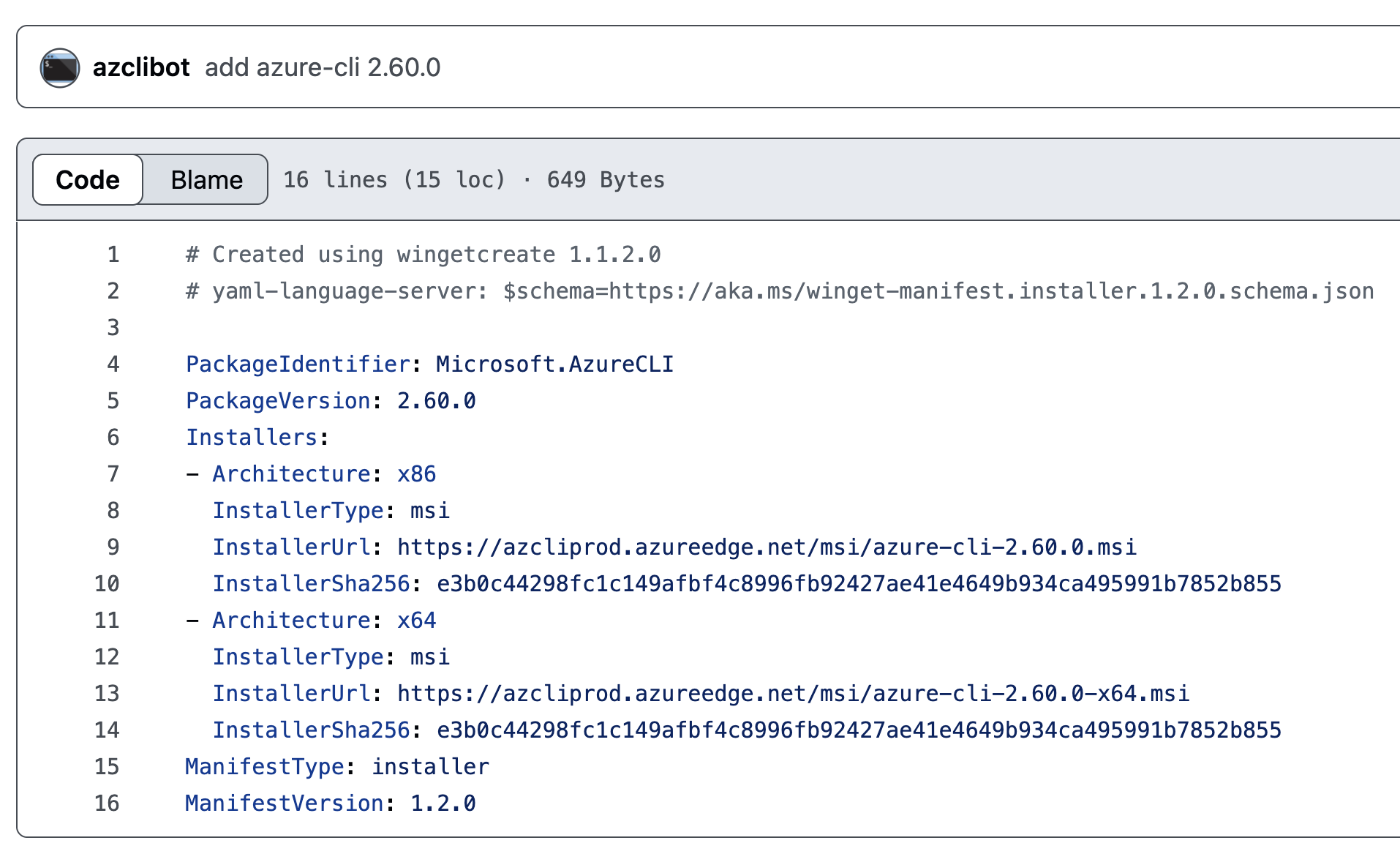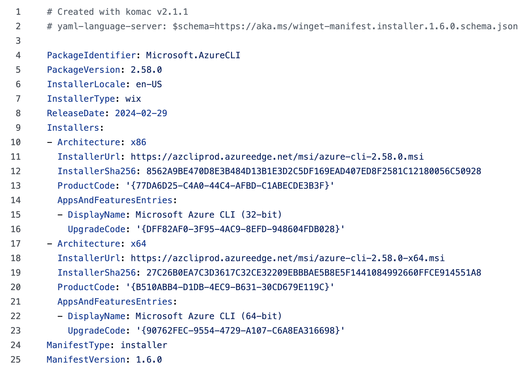 Figure 21. WinGet Package manifest for Azure CLI version 2.58.0