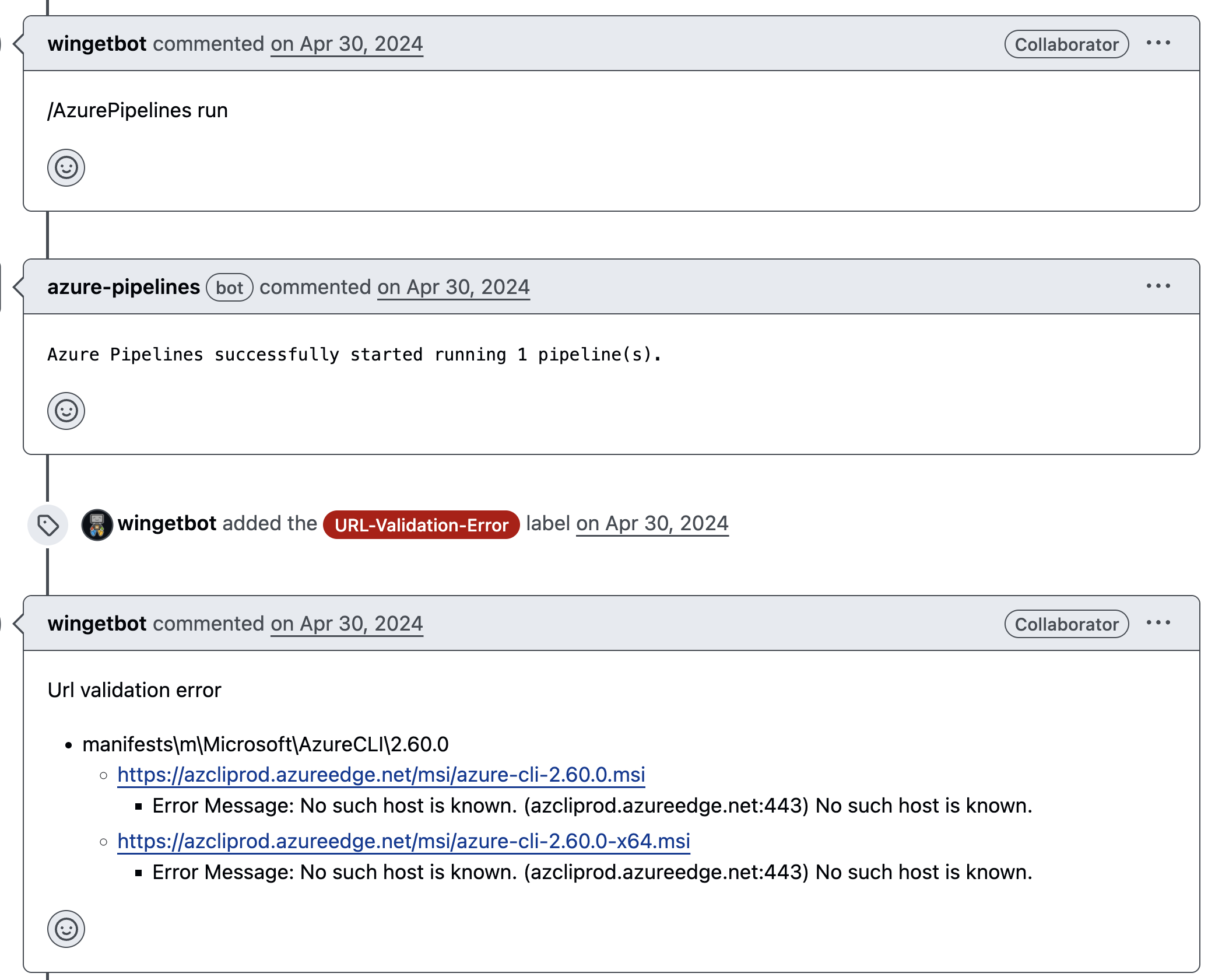 Figure 23. Missing CDN endpoint detected by wingetbot on azclibot’s pull request