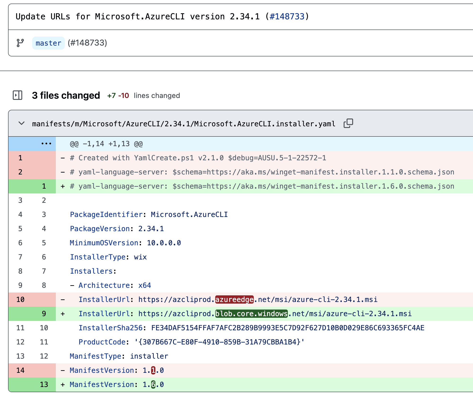 In this instance, we describe our discovery of a migration activity between different cloud services on GitHub. For distribution of Azure CLI MSI installer using WinGet, a package manager used to install applications on Windows 10 and 11, the distribution endpoints were changed from Azure CDN to Azure Blob Storage (Figures 19 and 20). Package manifest containing details about the installer download link, names, versions and so on is defined in YAML files.