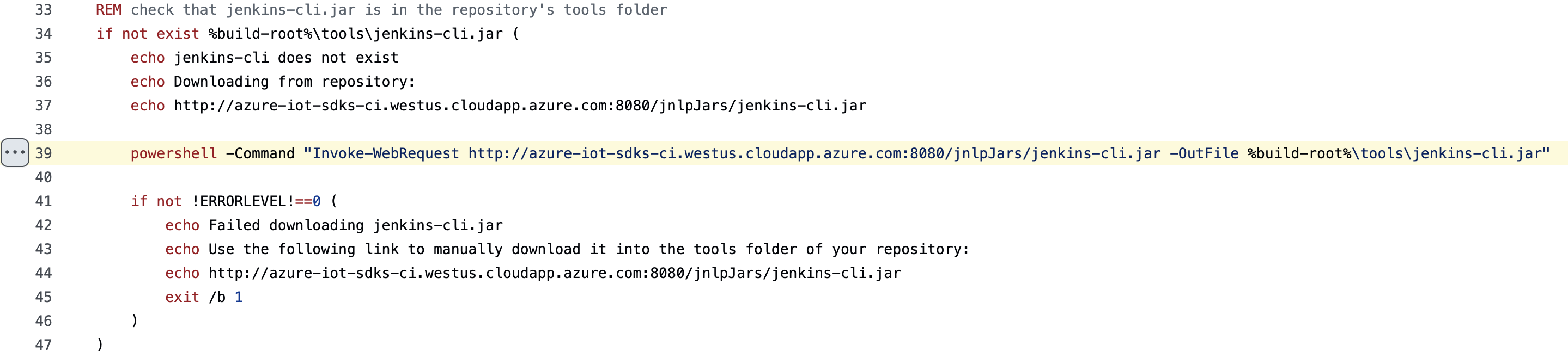 AMQP is used to build cross-platform, hybrid applications using vendor-neutral and implementation-neutral, open standard protocol. It is used to construct cross-platform applications. The Jenkins script is particularly interesting: It checks if a “jenkins-cli.jar” file is present in the repository's tools folder (Figure 28). If the file is missing, it attempts to download it from a remote URL using PowerShell. If the download fails, it outputs an error message and stops the script. At line 39, the JAR file is fetched from the Public IP endpoint (Figure 28); it is executed using Java at line 101 (Figure 29).