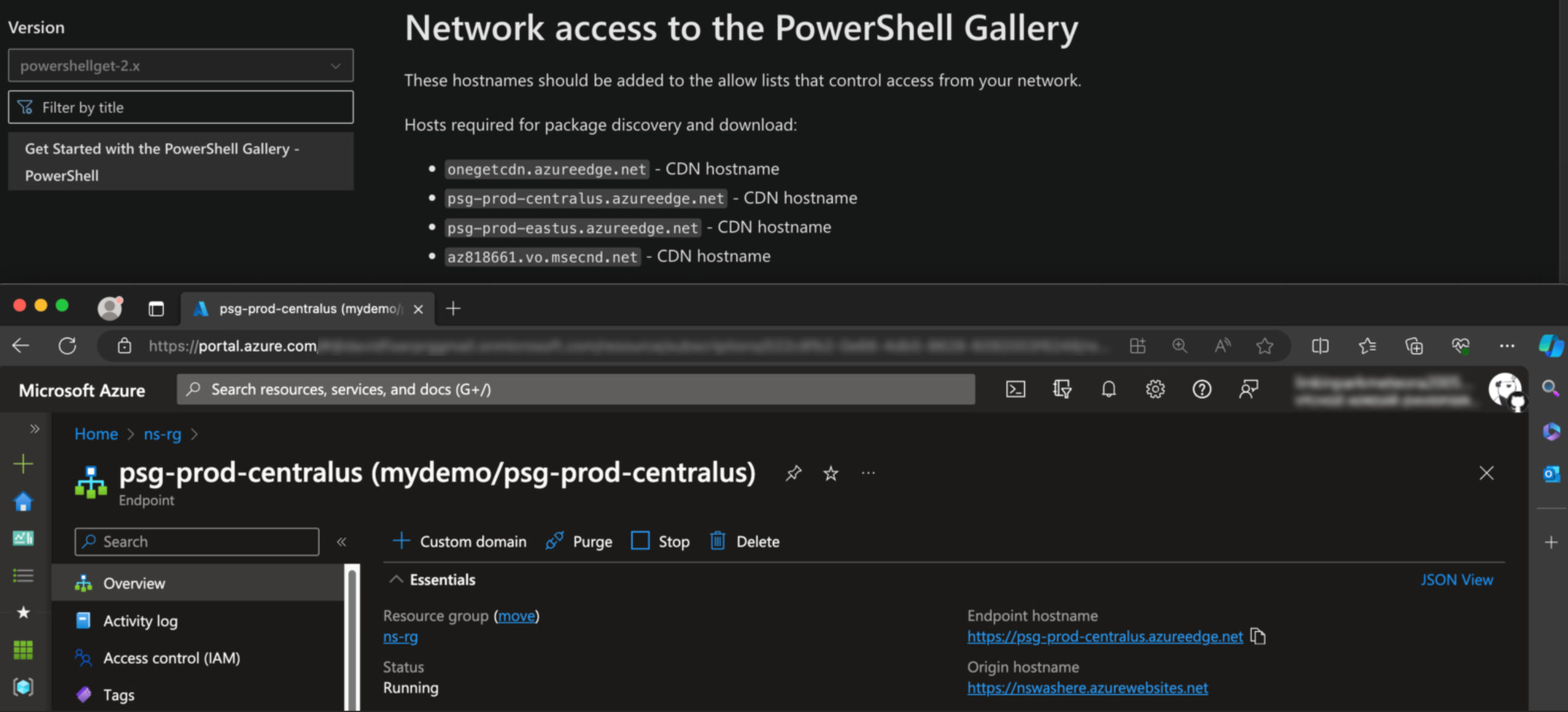 Microsoft documentation for PowerShell Gallery is tracked on a GitHub repository named “MicrosoftDocs/PowerShell-Docs-PSGet”. In this GitHub repository, we came across an Azure CDN Endpoint named “psg-prod-centralus” mentioned in line 135 (Figure 31).