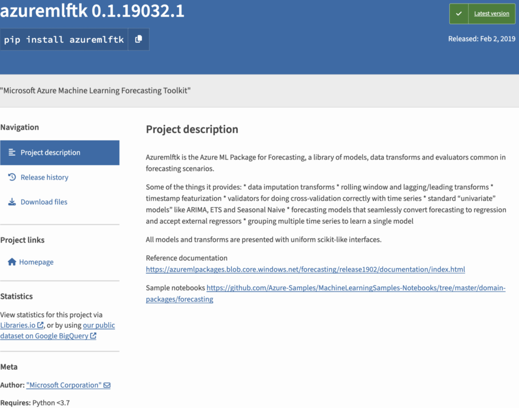 Figure 33. Project description of the “azuremlftk” package with references to a dangling Azure Blob endpoint
