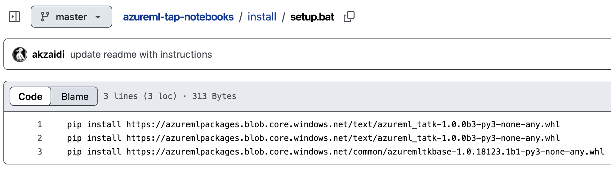 At the time of our discovery. the GitHub repository mentioned in the sample notebooks on the project description (“Azure-Samples/MachineLearningSamples-Notebooks”), contained a batch script that installs a Python wheel (WHL) package, as shown in Figure 34.