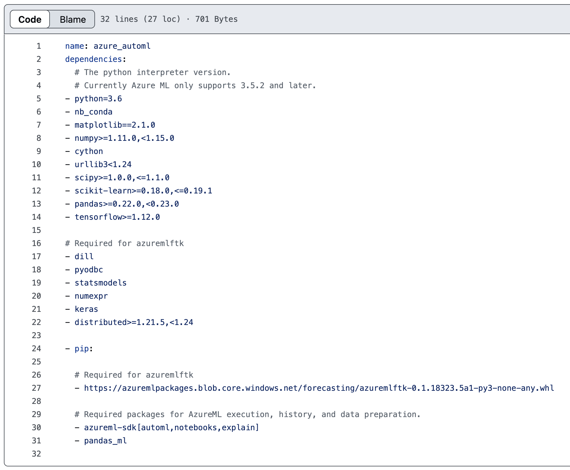 Figure 35. Azure Auto ML config installing “azuremlftk” package from dangling Azure Blob endpoint